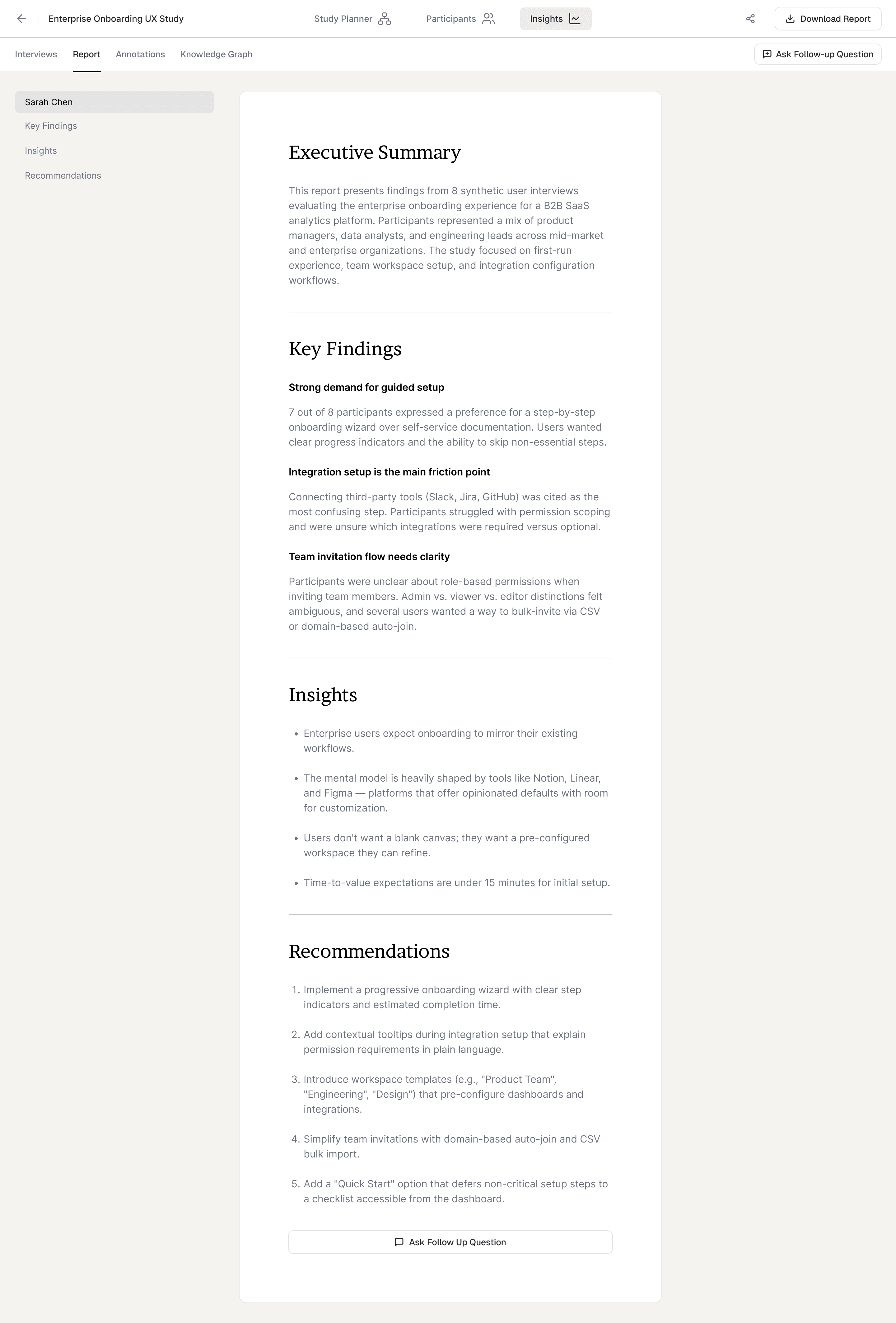 Synthetic Users is an AI platform that lets teams run user interviews with synthetic participants. Enterprise clients like JP Morgan use it to validate ideas at scale.