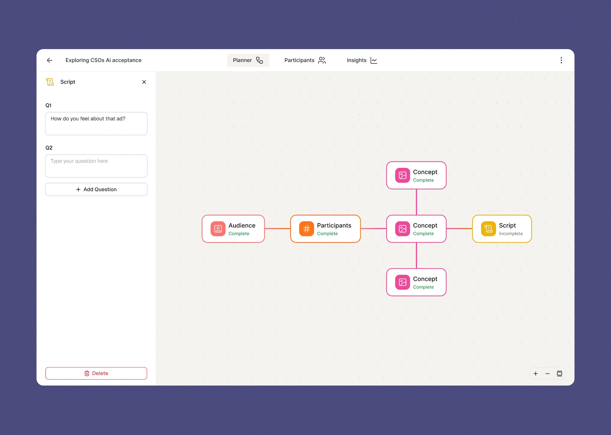 Same ingredients, different recipes. A concept test and a discovery interview use the same components, configured differently.
